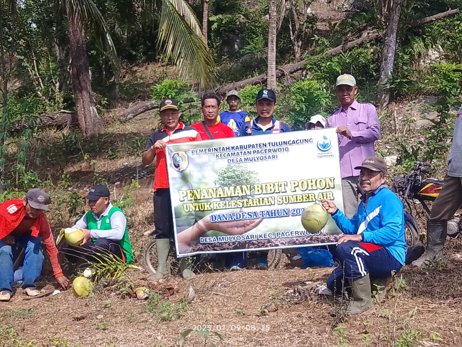 Kegiatan penanaman bibit pohon oleh Pemerintah Desa Mulyosari, Kecamatan Pagerwojo, Kabupaten Tulungagung, sebagai upaya pelestarian sumber air yang didanai oleh Dana Desa tahun anggaran 2025. Kegiatan tersebut dilakukan oleh Kepala Desa, Perangkat Desa dan masyarakat. (Kamis,